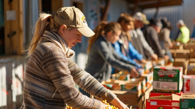 Volunteers pack food boxes for distribution in a sunny outdoor setting