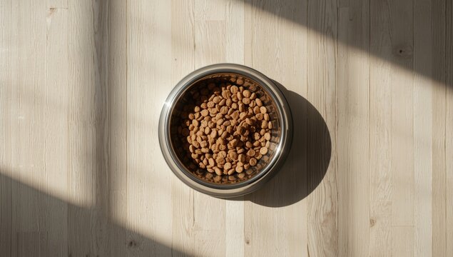 Centered dog food in a metallic bowl feeding area for pet care or layout backgrounds