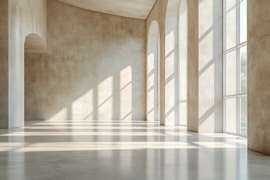 Empty beige room with panoramic windows and arches. Minimalistic design, beautiful banner with space for text