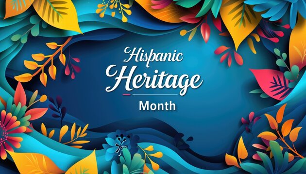 Colorful abstract foliage surrounding the text "Hispanic Heritage Month" on a deep blue background.