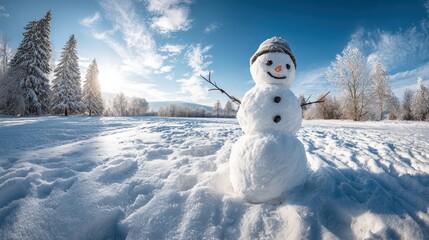 Wide-angle photo of a smiling snowman in a snowy landscape with open text area
