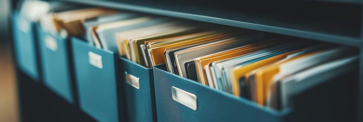 Sunlight streaming through vintage filing cabinet drawer with manila folders, dust motes