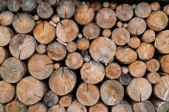 Snow-covered stacked logs lining rural yard, falling snow, receding timber pile