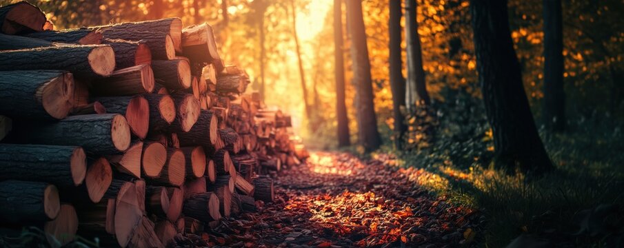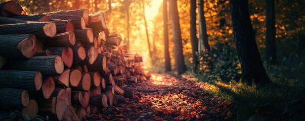 Wooden logs stacked beside a sunlit forest path in autumn foliage, copy space for text