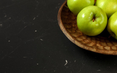 Green apples on wooden carved bowl, only part visible at black board - wide banner with space for text left