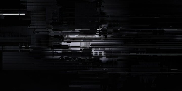 A pure black surface with minimalistic, digital glitch effects, Structured and fragmented composition