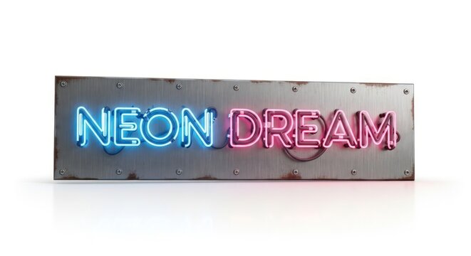 A neon sign with the words "NEON DREAM" illuminated in blue and pink, mounted on a distressed metal panel.
