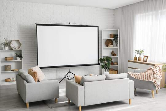 Interior of living room with sofa, armchairs, shelving units and projector screen near white brick wall