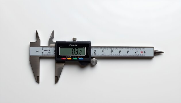 A caliper with a scale, placed against a white background. The caliper has a digital display showing 0, indicating that it is currently not being used to measure anything