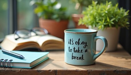 Turquoise mug with text its okay to take break sits on wooden table next to open book glasses and notebook. Potted plants on windowsill create calm atmosphere. Morning sunlight streams through window.