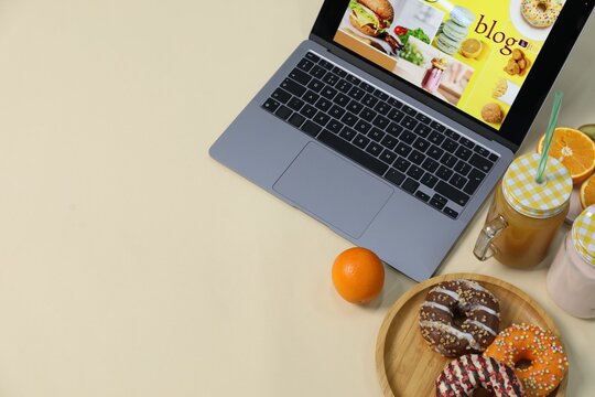 Summer beach blog design with seashells frame on blue background top view plenty of space for text
