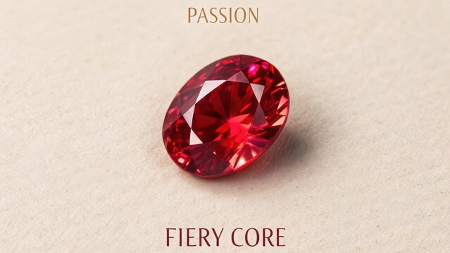 An oval cut vibrant red ruby gemstone with fiery core reflections on a textured background, representing passion