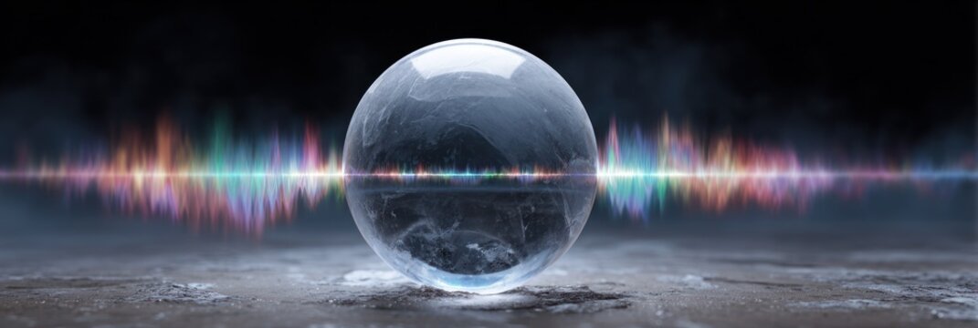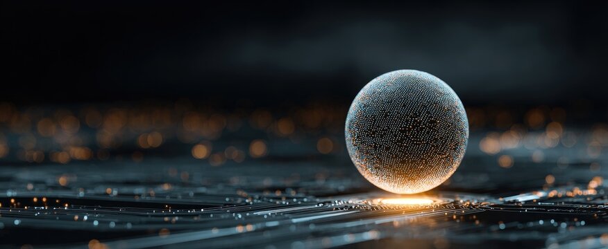 Macro glass sphere reflecting circuit grid, bubble-filled orb on dark reflective surface