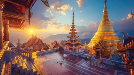 Sunrise over ancient temples in bagan with hot air balloon in sky