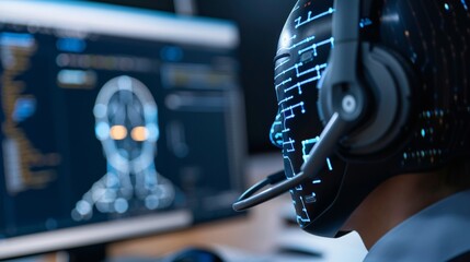 A focused individual analyzes data on multiple screens, showcasing a high-tech environment filled with programming code and digital information.
