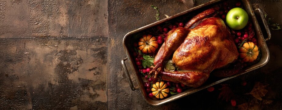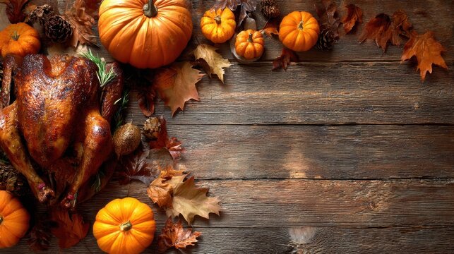 Autumn roast turkey with pumpkins and leaves on rustic wooden table scene for Thanksgiving display