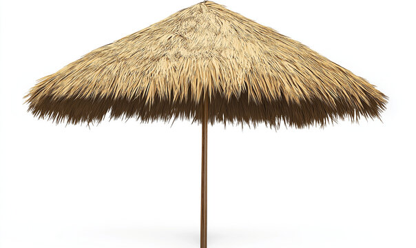 Beach umbrella, thatched roof, tropical parasol, straw canopy, natural materials, sun protection, island vacation, beige tones, isolated object, white background, resort accessory, outdoor furniture