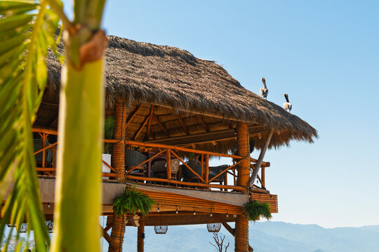 Pelicans roost on top of a thatched hut roof on a seaside cafe in the Romantic Zone of Puerto Vallarta, Mexico.