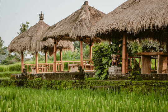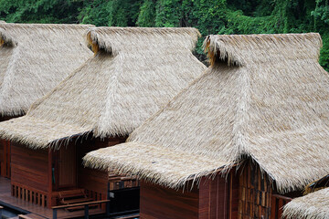 traditional japanese houses in shirakawago, gifu prefecture, japan, thatched roofs, triangle, wooden, rice paddies, rice