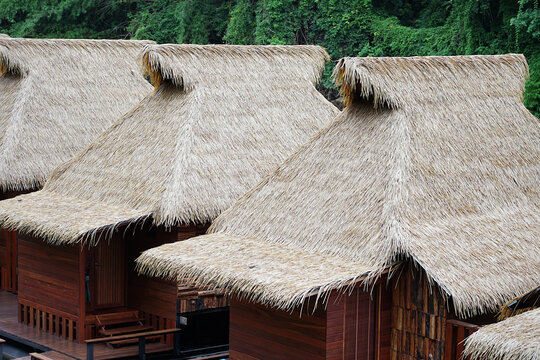 Serene Coastal Resort: A picturesque aerial view showcases an idyllic coastal resort, where luxurious bungalows with thatched roofs stand over the crystal-clear turquoise waters.