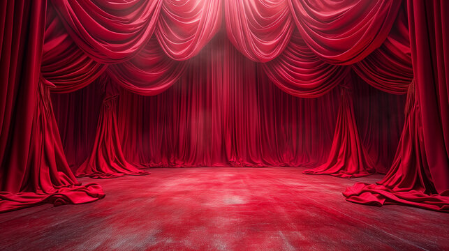 Empty theatre stage with red curtain. Stage background with copy space