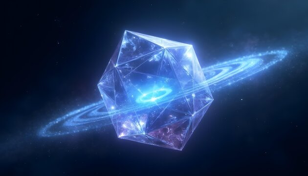 Transparent hexagonal crystal floating in deep space with glowing energy wave inside symbolizing quantum time crystal futuristic science and advanced physics concept