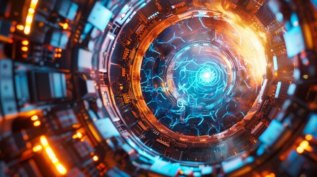Intricate thermonuclear fusion reactor with swirling plasma and advanced machinery harnessing energy