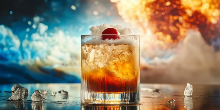 Hiroshima cocktail showcases stunning layers that simulate the visual impact of a thermonuclear explosion, creating an artistic representation of the Hiroshima cocktail experience.