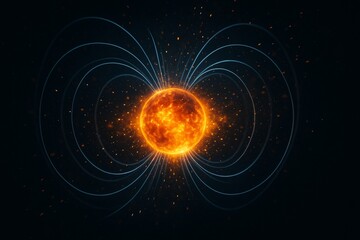 Glowing sun-like sphere with magnetic field lines and sparks on dark background conveying energy and science concept with copyspace and light.. Ai generative