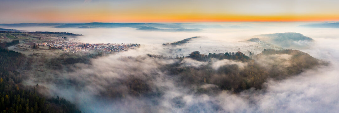 Germany, Baden-Wurttemberg, Berglen, Drone view of village shrouded in thick fog at dawn