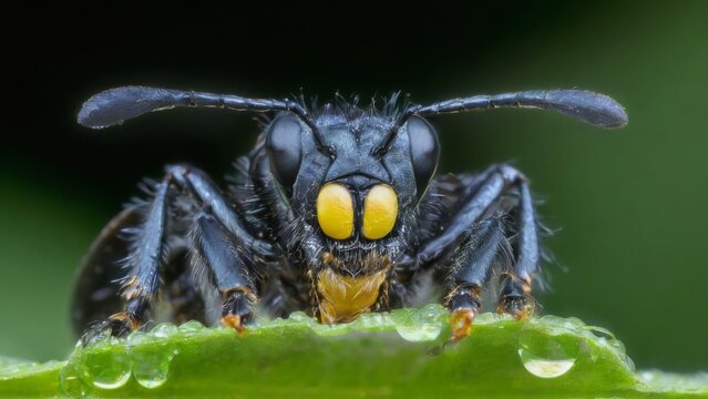 A macro photograph captures a small, dark-bodied insect with prominent antennae resting on a thin, fuzzy plant stem, set against a blurred backdrop of warm colo