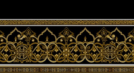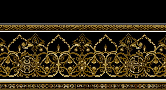 A horizontal decorative borders with intricate gold floral and geometric patterns against a black background, framed by thin gold and white lines.