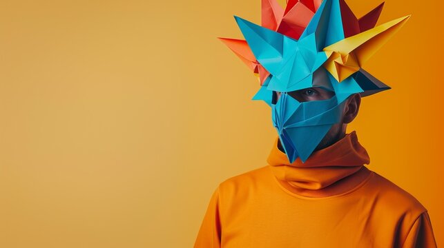 Cool man wearing 3d origami mask with stylish colored clothes - Creative concept for advertising, animal head mask doing funny things on colorful background