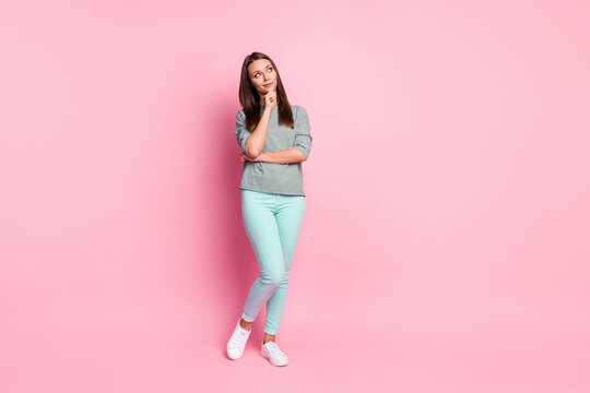 Full size photo of thinkable sweet girl stand look empty space wear blue pants sneakers shirt isolated on pink color background