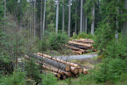 Peach orchard care. Spring thinning of the crown of trees. Cut branches are lying on the ground between the rows.