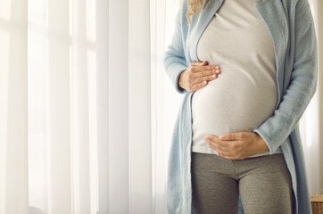 Close up of tummy of pregnant woman who gently supports him with her hands in anticipation of meeting baby. Cropped image of woman by window at home. Concept of motherhood, pregnancy and happiness.
