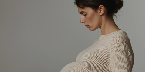 A pregnant woman stands in a stylish kitchen, holding a cup tea and reflecting on impending motherhood in a serene atmosphere