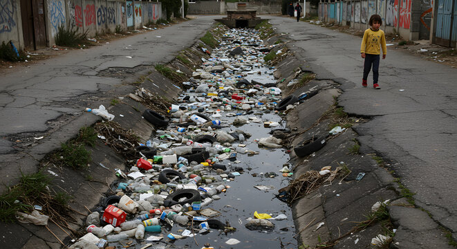 Young boy in slum area facing dirty, trash-laden streets with puddles and debris, capturing the gritty reality of life in impoverished urban settings
