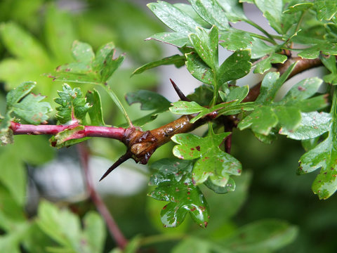 Dried desert tree branch with long thin thorns against blurred background at day light