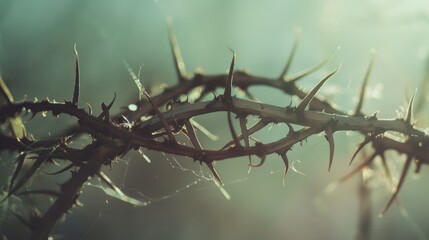 Thorny branches entangled against a soft, glowing backdrop, capturing a contrast between the harsh nature of thorns and the serene light.