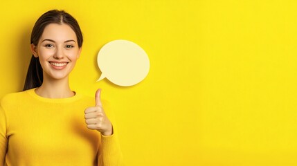 A smiling woman with a thought bubble gives a thumbs up