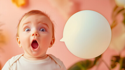 A baby with wide eyes and an open mouth looks up, with a thought bubble above.