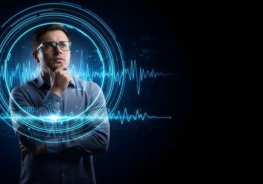 Thoughtful businessman surrounded by glowing digital wave interface, analyzing data signals and trends, representing strategic thinking, innovation, analytics, technology driven decision making