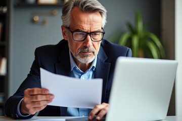 Thoughtful senior businessman analyzing reports on laptop while sitting at modern desk in stylish office environment