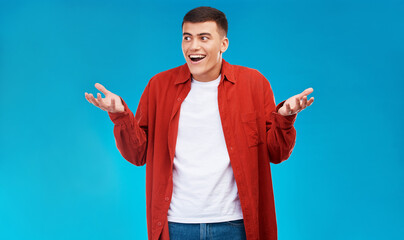 Confused, shrug and young man in a studio with options, decision or comparison expression. Shock, balance and male model from Canada with doubt hand gesture isolated by blue background with mockup.