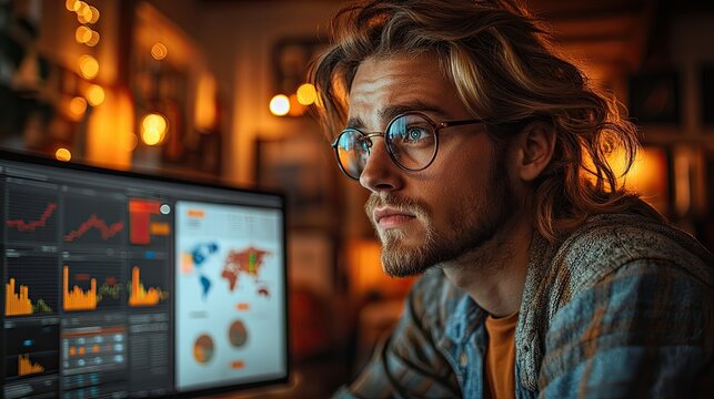 A focused and determined professional working intently on a laptop in a home office environment surrounded by data visualization graphs and charts showcasing their dedication to analytical work