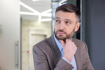 Portrait of a serious businessman thinking deeply in a corporate office setting with a confident look.