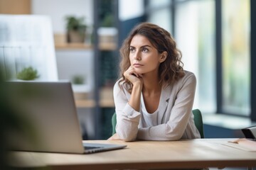 A woman with curly hair sitting at a desk with a laptop, looking thoughtful.
