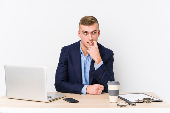 Young handsome man working after a shower relaxed thinking about something looking at a copy space.