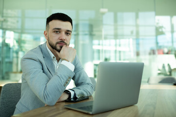 Young serious pensive businessman work on market research sit at desk with laptop in modern office with diverse businesspeople on background. Modern tech, business project, challenge, workflow concept